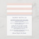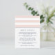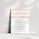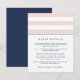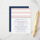 Projetado para coordenar com nossas coleções de convites de casamento Blush e marinho Metro Stripe, esta placa chic simples e pré-disquete contém letras azuis marinhos com faixas largas, cor-de-rosa e brancas, e uma fina banda de marinho. Substitua o texto da amostra pelos detalhes chave da sua celebração do casamento. Que informações incluir em um convite de casamento? Considere detalhes como acomodações de hotel, códigos de grupo, transporte, informações de recepção de boas-vindas e sua URL do site de casamento.