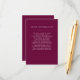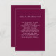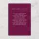 Esta placa de inserção de informações de convidado de eterno apresenta uma sombra profunda de burgundy/rople. Você pode usar esses cartões para incluir informações sobre sua recepção de casamento, direções de condução, acomodações e qualquer outra coisa que você precise que seus hóspedes saibam! Este design é parte da Burgundy Boho Botanical Wedding Suite a partir de Designs de Papel Impresso.