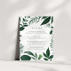 Projetado para coordenar com a nossa coleção de casamento Florestas Selvagens, este elegante cartão de informação botânica de inverno apresenta uma fronteira de uma rica folhagem verde de cor aquática que envolve os seus principais detalhes de casamento, como alojamentos de hotel, informações de recepção de boas-vindas, site e muito mais. Adicione seu texto personalizado usando os campos fornecidos e ajuste fontes, tamanhos e espaçamento, se necessário.