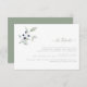 Este elegante cartão de detalhes de casamento contém lindas folhas verdes e amoras azuis poeirentas pintadas manualmente, organizadas em um buquê simples e na moda. O texto e o script são verdes. A parte de trás do convite é verde senador simples para combinar com a frente.