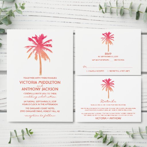 Estas cartas de inserção são perfeitas para qualquer casal planejando uma celebração romântica de casamento na praia. O design apresenta uma palmeira aquarela tropical em tons de rosa-coral quente, vermelho e laranja num fundo branco limpo, com uma redação editável coordenada por cor. O design simples pode ser personalizado para se adequar ao seu evento especial e será o personagem perfeito para qualquer festa temática tropical, incluindo chás de panela, noivados, chás de casamento, festas de aniversário e muito, muito mais.