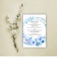 Um cartão de cerimônia de casamento bonito e floral, com um tema vintage/boho adorável, com uma grande e azul coroa floral contra um fundo branco comum. Este cartão seria ideal para um casamento botânico ou de jardim, e pode ser facilmente personalizado com suas próprias instruções para seus convidados de casamento para o grande dia.