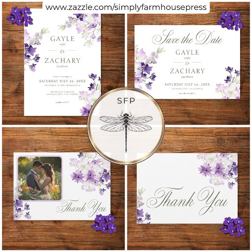 Capture a essência da elegância rústica com nosso belo cartão de detalhes de casamento floral boho. Delicados buquês de flores silvestres roxas e lavandas, pintados à mão em estilo de aquarela solta, são artisticamente arranjados com folhagem verde-sage. Este design evoca um senso de beleza natural e charme romântico, perfeito para o seu casamento ao ar livre ou no jardim. Criado por Simply Farmhouse Press.