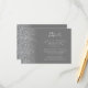 A borda esquerda deste elegante e moderno cartão de detalhes de casamento contém um design brilhante falso prateado. O texto personalizável combina a escrita manual de cinzas prateadas pálidas, fontes copperplate e itálico em um fundo de cinza. O verso apresenta uma cinza e um design cintilante prateado.