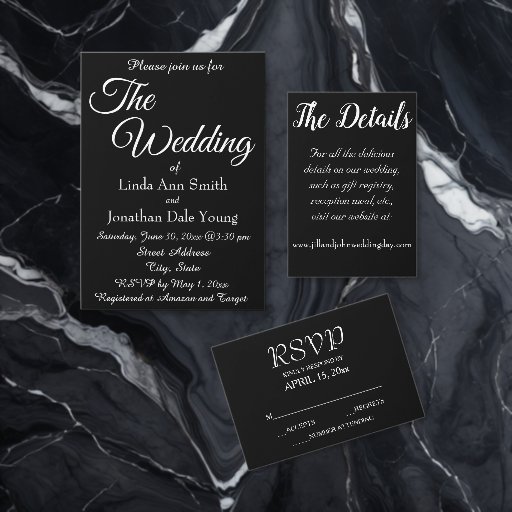 Cartão de inclusão de casamento vertical preto sólido com letra estilizada branca que dá as instruções para encontrar todos os detalhes do casamento do casal em sua página da web de casamento. Personalize seu cartão de inclusão editando o texto conforme desejado e substituindo o nome da página da web pelo seu.