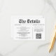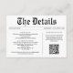 Certifique-se de que seus convidados tenham todas as informações cruciais para seu grande dia com este cartão de detalhes de casamento inspirado no jornal na moda. Com o título "The Details" (Detalhes) em uma fonte de jornal clássica, o design estabelece claramente informações sobre recepção, alojamento e viagem, completas com um código QR para fácil acesso ao seu site de casamento ou fundo de lua de mel. Este design organizado e coeso oferece uma sofisticada e prática adição à sua suíte de papelaria de casamento.