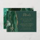 A borda esquerda deste elegante e moderno cartão de detalhes de casamento contém uma esmeralda verde aquarela agate borda aparada com falso brilho dourado. O texto está em um script de escrita manuscrita dourada e um tipo de letra de impressão em um fundo verde esmeralda. O verso apresenta um design verde e dourado correspondente.