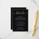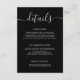 Esta elegante carta de detalhes do casamento apresenta um design sofisticado e eterno, perfeito para complementar qualquer tema do casamento. O fundo preto clássico fornece um contraste impressionante para o delicado título de "detalhes" da escrita branca e a tipografia serif legível e nítida utilizada para toda a informação essencial. Suas linhas limpas e estética refinada garantem que seus hóspedes recebam todas as informações logísticas necessárias de forma chic e na moda.
