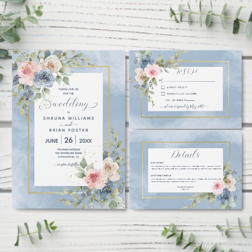 Dusty Pink Blue & White Roses Wedding Suite CardsCriado por Kathe Santillo