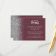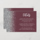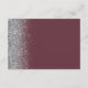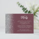 A borda esquerda deste elegante e moderno cartão de detalhes de casamento contém um design brilhante falso prateado. O texto personalizável combina a escrita manual de cinzas prateadas pálidas e as fontes sans serif num fundo vermelho escuro e vermelho. O lado inverso apresenta um design de burgundy e brilho prateado.