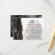 A borda esquerda deste elegante cartão de detalhes de casamento moderno apresenta uma borda de agata preta, aparada com falso brilho dourado. O título aparece no script de escrita manual em preto, com texto personalizável abaixo na camada de caracteres em negrito preto da placa de impressão. Substitua facilmente a imagem desbotada da amostra por sua própria foto. O verso apresenta um design de agate preto e dourado correspondente.
