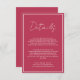Este cartão de cerimônia de detalhes do casamento é a maneira perfeita de compartilhar todos os detalhes do seu casamento em estilo. O design mínimo apresenta uma tipografia elegante num fundo viva magenta, fazer-o como uma bela adição ao seu dia especial. Este cartão personalizável fornece todas as informações de que seus convidados precisarão, incluindo acomodações, transporte e seu site de casamento. O design simples pode ser personalizado em qualquer cor, permitindo que você crie um toque personalizado para o seu grande dia. Com sua sofisticação e versatilidade, este cartão de cerimônia de detalhes do casamento é a escolha perfeita para a na moda e noiva e noivo modernos.