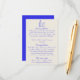 Simples e na moda retro azul, desenhando detalhes escritos de informações de convidados. Com fundo azul arrojado e formato de texto escrito à mão cremoso e garrafa e óculos de champanhe desenhados à mão. Todas as informações são personalizáveis como site, transporte, alojamento. Pegue junto com outros produtos desta mão clássica feita na suíte de casamento retrô.