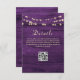 Boho, elegante, luzes de cordas de ouro no cartão de detalhes do casamento roxo de madeira rústica com código QR para mais informações.