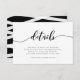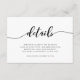 Cartão de detalhes de casamento elegante com a palavra "detalhes" em uma escrita cursiva relaxada em preto sobre um fundo branco. O cartão tem um verso preto com linhas brancas sobrepostas.