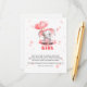 Adorável convite para o chá de fraldas com um lindo elefante bebê segurando balões cor-de-rosa em forma de coração, cercado por estrelas delicadas. O design do estilo aquoso macio em rosa pastel e cinzas cria uma atmosfera doce e sonhadora, perfeita para celebrar a chegada de um pequeno. Uma faixa rosa adorável na parte inferior oferece espaço para personalização, fazer ideal para o chá de uma menina.