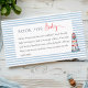 Este encantador cartão de recinto sobre temas náuticos é uma maneira sincera de convidar convidados a compartilhar uma história amada com um dentro de mensagem pessoal. O livro deles será tesouro durante anos, enchendo a biblioteca do nosso bebê com amor, aventura e memórias de queridos amigos e familiares. Uma adição perfeita ao seu chá de fraldas náutico, esta placa de gabinete apresenta um design marítimo elegante com marinho clássico e tons brancos, fazer-a uma bela marca de manutenção.