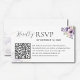 Elegant wedding RSVP card featuring soft lavender florals on a clean white background with a modern QR code RSVP option. Designed for today’s weddings, this minimalist response card allows guests to easily scan and reply online while maintaining a timeless, sophisticated look. Perfect for modern, classic, garden, and evening weddings. Coordinates seamlessly with matching invitations and full wedding stationery suites.