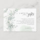 O cartão de encerramento do poço de desejos de casamento Watercolor Eucalyptus Botanical Sage é uma peça linda e refinada que complementa perfeitamente qualquer conjunto de convite de casamento. As delicadas lavagens de aquarela em verde sálvia e folhas suaves de eucalipto criam uma sensação de beleza natural e tranquilidade, enquanto os elementos botânicos são elaborados de forma intrincada para criar uma composição harmoniosa e sofisticada. A tipografia é simples, mas elegante, com um script moderno que adiciona um toque de romance e calor. Itens correspondentes estão disponíveis.
