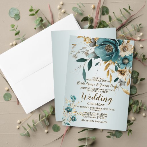 Cartão De Informações Festa de casamento Turquesa Folhas do Ouro da Flor