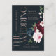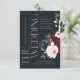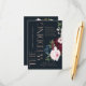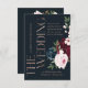 Cartão de recepção de casamento preto, elegante e romântico com as nossas elegantes flores de aquarela pintadas. Lindos arranjos florais arrojados, com azul-marinho rico e robusto, flores com sotaques de folhas verdes e verde-luxuosas. Os florais estão organizados em belos buquês para criar este design floral ousado e elegante. "O Casamento" é exibido em uma elegante design de tipografia rosa dourada falso com os detalhes da recepção de casamento bem arranjados. Florais de aquarela pintados por moodthologia.