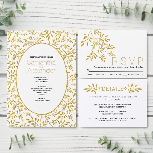 Este cartão de casamento da moda está com galhos encantadores com folhas feitas de falsa brilho de ouro e sua redação. O dorso é coberto por um padrão feito de folhas brancas sobre fundo de ouro brilhante.