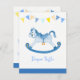 O cavalo de hobby azul-balanço pintado à mão com estrelas e bunting gráfico, cartas de fralda de chá de fraldas. Perfeito para você pedir fraldas ou fraldas para que seu convidado possa ganhar prêmios em seu chá de fraldas. Pintura aquosa e design gráfica originais e brancos do bebê, pintor azul de cavalo agitado, por Sarah Trett, para www.mylittleeden.com no zazzle.
