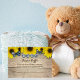 Madeira russa e meteorológica com girassóis amarelos e borboletas azuis, boné azul e branco "Baby" tipografia. #zazzlemade, #rústico, #girassóis, #garrafas, #vida rural #borboletas