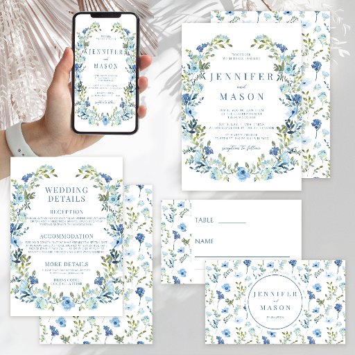 Capture o encanto da sua celebração de casamento boêmio na primavera/verão com este cartão de detalhes romântico e elegante, apresentando uma vibrante grinalda floral azul. Adicione um toque de sofisticação à sua celebração marcante com esses cartões requintados.