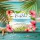Entra num paraíso tropical e informa os seus convidados sobre os detalhes da sua recepção com estes cartões de cerco inspirados na ilha que incluem uma praia de aquarela arenosa e turquesa ondas oceânicas sobre o fundo com flores rosa e coral hibiscus e folhas de palmeiras.