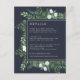 Projetado para coordenar com a nossa coleção de casamento de Estufa, este elegante e impressionante cartão de informação botânica para convidados apresenta uma fronteira de folhagem verde-aquática, folhas botânicas e pequenas flores brancas que enquadram seus principais detalhes de casamento, como acomodações de hotel, informações de recepção bem-vindas, site e muito mais em um rico fundo azul-marinho.