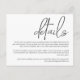 Essa simples placa de gabinete tem apelo minimalista e estilo moderno. O design apresenta a palavra "detalhes" em uma face moderna, escrita à mão. Os detalhes são exibidos em uma face nítida do tipo serif e são justificados corretamente. O olhar é chic com um talento congênito. Use este cartão como um recinto com seus convites de casamento para fornecer detalhes importantes para seus convidados de casamento. Você pode incluir informações como acomodações de hotel, informações de transporte, eventos e atividades especiais, seu site de casamento ou quaisquer outras informações que você queira incluir. Se precisar de mais espaço, use a parte traseira da placa para adicionar texto adicional. Outros itens de casamento correspondentes estão disponíveis nesta design única para uma busca coordenada pelo seu dia memorável.