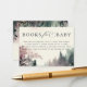 Uma ilustração com aquarela esbranquiçada da folhagem esmagadora em verde esmeralda e mauve e roxo, brilhante com luzes de fadas e poeira mágica, com as montanhas ao fundo e uma adorável fada escondida no verde, decora esse companheiro de convite para chás de fraldas, o cartão de cerimônia "Livros para Bebê" com um tema de floresta encantada. Um convite elegante e moderno para um chá de fraldas de conto de fadas. Perfeito para as mães serem quem ama o cenário da floresta de conto de fadas, o tema da floresta de fadas ou do jardim de fadas e esmeralda verde, mauve e ouro.