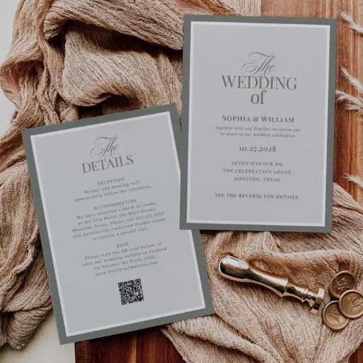 Estes elegantes e antigos cartões de cerimônia de núpcias de estilo monetário apresentam uma mistura de textos verdes clássicos e caligrafia moderna, juntamente com um código de QR digitalizável para que os convidados possam visitar seu site online para obter detalhes ou para RSVP. Este design verde-leve, elegante e minimalista é perfeito para o seu eterno, casamento formal.
