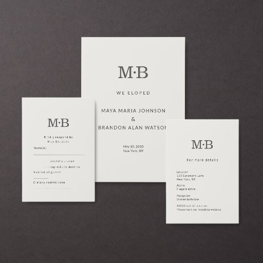 A minimalist modern wedding details card designed for elegant elopements and intimate celebrations. This clean, editorial-style details card features refined typography, soft neutral tones, and a timeless monogram layout that pairs seamlessly with modern and all-in-one wedding invitations.