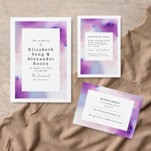 Este cartão de cercado contém uma bela mistura de púrpuras, blues e pinks em um design de aquarela macia. Com tipografia limpa e contemporânea, ela combina perfeitamente elegância artística e um toque moderno para seu dia especial.