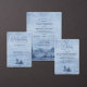 Esta suite moderna de casamentos de aquarelas combina montanhas pintadas manualmente, lago, árvores e pássaros com fundo de aquarela azul-claro com gotas brancas borbulhantes parecidas com flocos de neve e também confete. Sombras de azul claro, azul escuro. Tipografia moderna. É perfeito para casamento no inverno, casamento de acampamento, casamento ao ar livre.