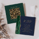 A borda esquerda deste elegante e moderno cartão de cerimônia de núpcias apresenta uma borda esmeralda verde aquarela, aparada com falso brilho dourado. O título aparece em um script de escrita manuscrita dourado, com texto personalizável abaixo na fonte em copperplate em um fundo azul de marinho. Carregue o código QR do seu site de casamento para substituir a imagem de amostra no verso, enquadrado pelas palavras "digitalize-me para RSVP".
