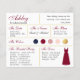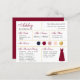 Um cartão de informações para madrinha em burgundy e dourado, incluindo informações sobre a data e local do casamento, as cores do casamento, os membros da comitiva nupcial, o vestido da madrinha e uma mensagem de pedido de madrinha. O nome da madrinha e os títulos são escritos em uma fonte elegante em burgundy. No canto inferior direito, há um vestido burgundy. No centro, estão as cores do casamento em círculos. As cores, incluindo a cor do vestido de noiva, podem ser alteradas, com exceção do círculo dourado, que é em folha de ouro falso. As cores padrão são azul-marinho, burgundy, rosa poeirento, rosa cor-de-rosa e dourado.