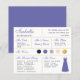 Um cartão de informações de madrinha para um casamento roxo e dourado, incluindo informações sobre a data e local do casamento, as cores do casamento, o grupo da noiva, o vestido de madrinha e uma mensagem de convite para ser madrinha. O nome da madrinha e os títulos são escritos em uma fonte elegante violeta. No canto inferior direito, há um vestido violeta. No centro, estão as cores do casamento em círculos. As cores, incluindo a cor do vestido de noiva, podem ser alteradas, com exceção do círculo dourado, que é de falso foil dourado. As cores padrão são azul-marinho, violeta (roxo), lavanda (roxo claro), rosa bege e dourado. O verso é lavanda, como a cor do vestido de madrinha.