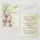 Este cartão de alojamento floral, púrpura e verde de ameixa bonito tem borboletas verdes FAUX (simuladas) e flores roxas de mauve e ameixa que correspondem ao convite de casamento mostrado abaixo. OBSERVE que não há nenhum relevo ou imagens levantadas. Você também pode usá-lo como um cartão de recepção ou de instruções, um registro de presentes ou um cartão de poço de desejo, ou um cartão de informações de casamento, alterando o texto de acordo. ****POR FAVOR, OBSERVE que tudo será impressão como você vê no seu monitor. Não verei o seu produto e o Zazzle NÃO editará nada para erros de digitação, alinhamento etc., portanto, certifique-se de que todo o seu texto esteja centralizado e sem erros. Se precisar de assistência, envie-me um e-mail ANTES de fazer seu pedido. Se necessitar de itens correspondentes, envie um e-mail para niteowlstudio@gmail.com.