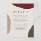 Um cartão de detalhes de casamento simples, elegante e estilizado artisticamente para fornecer aos seus convidados todas as informações importantes sobre o seu grande dia. Este design tem uma rica paleta de cores de outono com tons de vinho burgundy, terracota e formas abstratas verdes ao longo das bordas do design. Um fundo bege combina bem com as cores de outono. Pares de tipos elegantes são usados para transmitir os detalhes do seu casamento com um estilo lindo. Personalize o modelo de texto com o texto desejado.