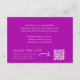Informações de casamento de orquídeas roxas, simples e de dupla face, no cartão de cercado. Este cartão de recepção faz parte da coleção de casamentos de flores de orquídea. Ideal para usar como cartão de informação de casamento após a cerimônia, ou como cartão de instruções para manter o convidado informado sobre os dias e a festa à frente, também pode ser usado um cartão de registro de presente, um cartão de alojamento, um cartão de obrigado de desejo com sua fatia de bolo de festa ou até um cartão de site de casamento mudando o texto personalizável na frente e no verso. Inclui um código QR para envio de fotos no dia ou para direcionar seu convidado para o site do casamento. Pintura única à mão com aquarela, cor abaulada e design por Sarah Trett para www.mylittleedenweddings.com