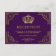 Cartão de recepção elegante com uma elegante borda de ornamentado de ouro e uma bela coroa contra fundo roxo escuro.