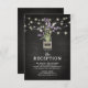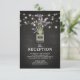Cartões de recepção de casamento country chic com um fundo de quadro-negro preto rústico, luzes de corda, um jarro de pedreiro com flores de lavanda roxa, envolto em aniagem com as iniciais do casal e um modelo de recepção noturna elegante que é facilmente personalizado.