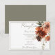 Esta design moderna, mas rústica, de recepção de casamento apresenta um buquê de canto de pessegueira, ruiva, terracota, flores marrom e branca. O fundo é branco com uma imagem fina verde-sábio; o fundo é um verde-sábio macio. Esta design faz parte da Rustic Terracotta Rust Flowers Wedding Suite de cartas criadas pela Simplesmente Farmhouse Press.