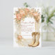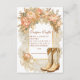 Um design de chá de fraldas cônico rústico com botas de vaquinha acentuadas com peônias cor-de-rosa pinceladas, verde macio e detalhes de ouro em ximersão. Perfeito para uma celebração de temas ocidentais com uma reviravolta floral feminina.