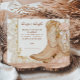 Um design de chá de fraldas cônico rústico com botas de vaquinha acentuadas com peônias cor-de-rosa pinceladas, verde macio e detalhes de ouro em ximersão. Perfeito para uma celebração de temas ocidentais com uma reviravolta floral feminina.