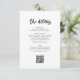Estes cartões de visita de convidados de chic e na moda, preto e branco apresentam um roteiro casual moderno para um aspecto simples mas totalmente moderno. Todos os detalhes do seu casamento vão para o cartão, junto com um código de QR digitalizável para que os convidados possam responder online ou visitar o seu site de casamento. Essa é a maneira perfeita de compartilhar informações sobre acomodações de hotéis, recepção, serviços de vaivém, direções de condução e rsvp.