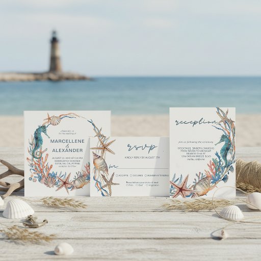 O cartão de recepção de casamento do tema Praia apresenta um cavalo-d-água, uma concha, estrelas-do-mar e coral com os seus detalhes de celebração, tais como o tempo e a localização em letras azuis empoeiradas. Perfeito para praia, litoral, náutica, destino e casamentos tropicais. Arte por KL Stock